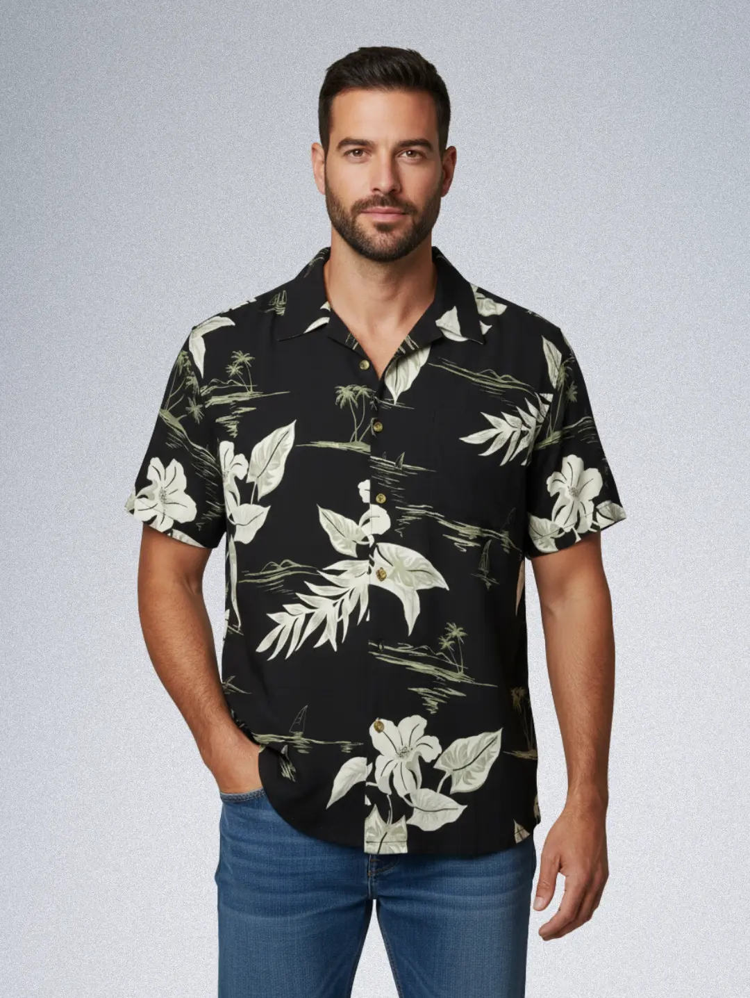 Island Blue Hawaiian Shirt – Men’s Black & White Tropical Print | Rayon Button-Down