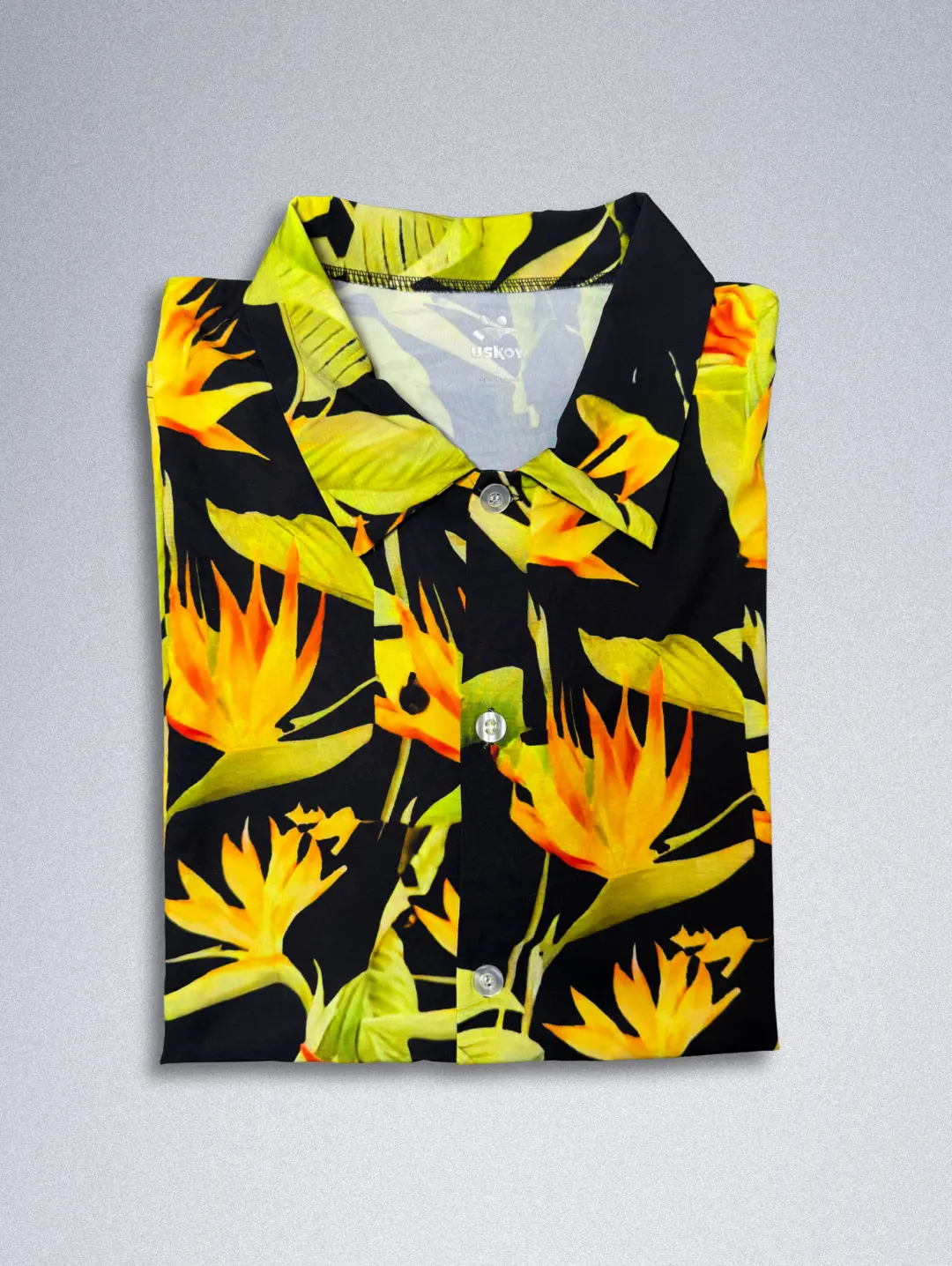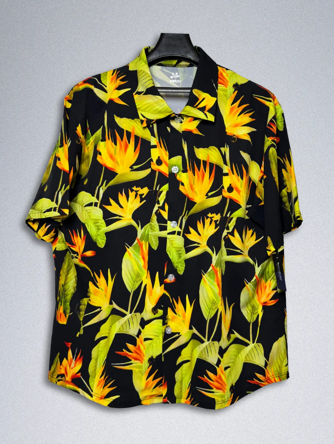 Escape to paradise with the USKOY Men’s Hawaiian shirt. Crafted from a luxurious silk blend, this shirt drapes beautifully and feels incredibly soft against the skin. The classic black background is brought to life by a vibrant Bird of Paradise print in fiery orange and bright lime green. With a relaxed fit, this short-sleeve button-down is perfect for the beach, a cruise, or any casual summer event. Experience the ultimate in comfort and style with this must-have tropical shirt.